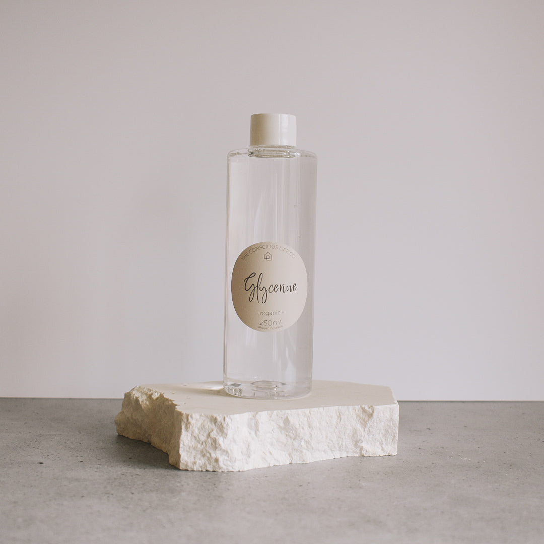 Glycerine, also known as Glycerin or Glycerol, is an invaluable vegetable derived natural ingredient. With emollient-like properties, which can soften and soothe the skin, it also works as a humectant and assists with retaining moisture in the skin. It is widely used in manufacturing and is commonly used in products such as soaps, cosmetics, lotions & moisturisers, scrubs, face masks, hair care products, and various household products.